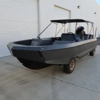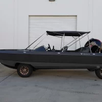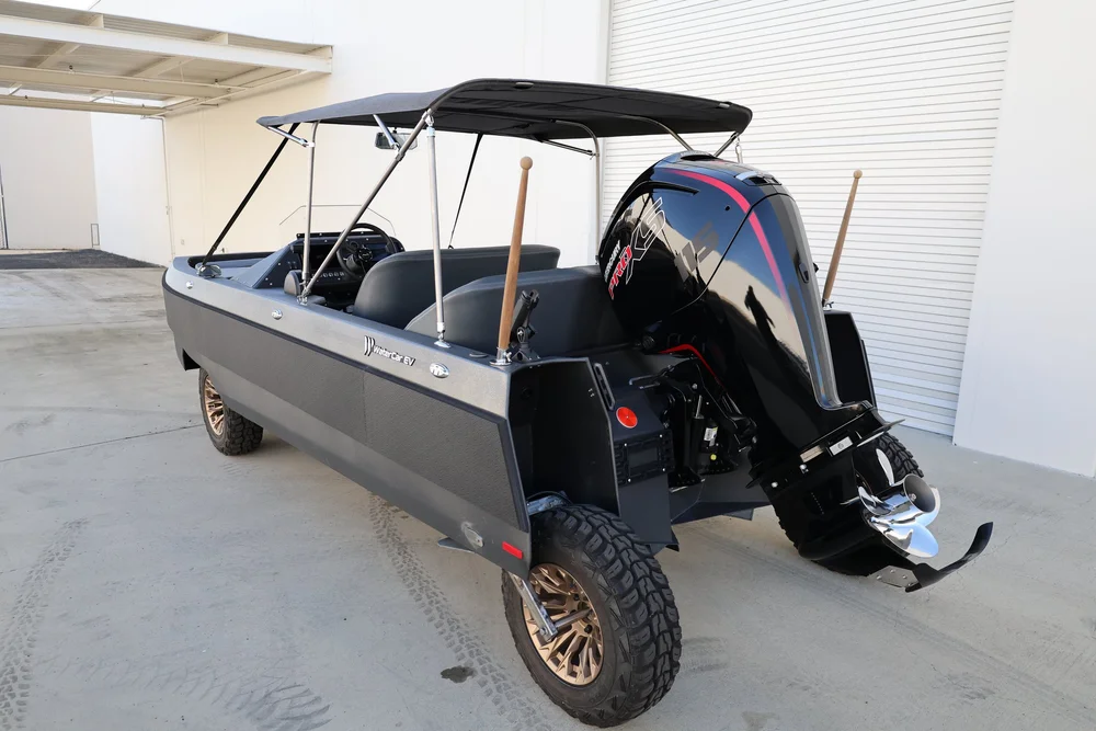 Built in a full matte-black finish with premium grey diamond-stitched seating, this WaterCar EV delivers a stealth, performance-driven look on both land and water. The black bimini top and bronze off-road wheels add a rugged, distinctive touch, making this one of the boldest builds in the lineup.